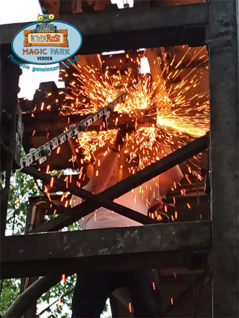 Bei der Wasserbahn müsste ein Bauteil für die neue Kette noch final angepasst werden. Weil es schon spät war und dämmerte, ist der Funkenregen besonders schön.